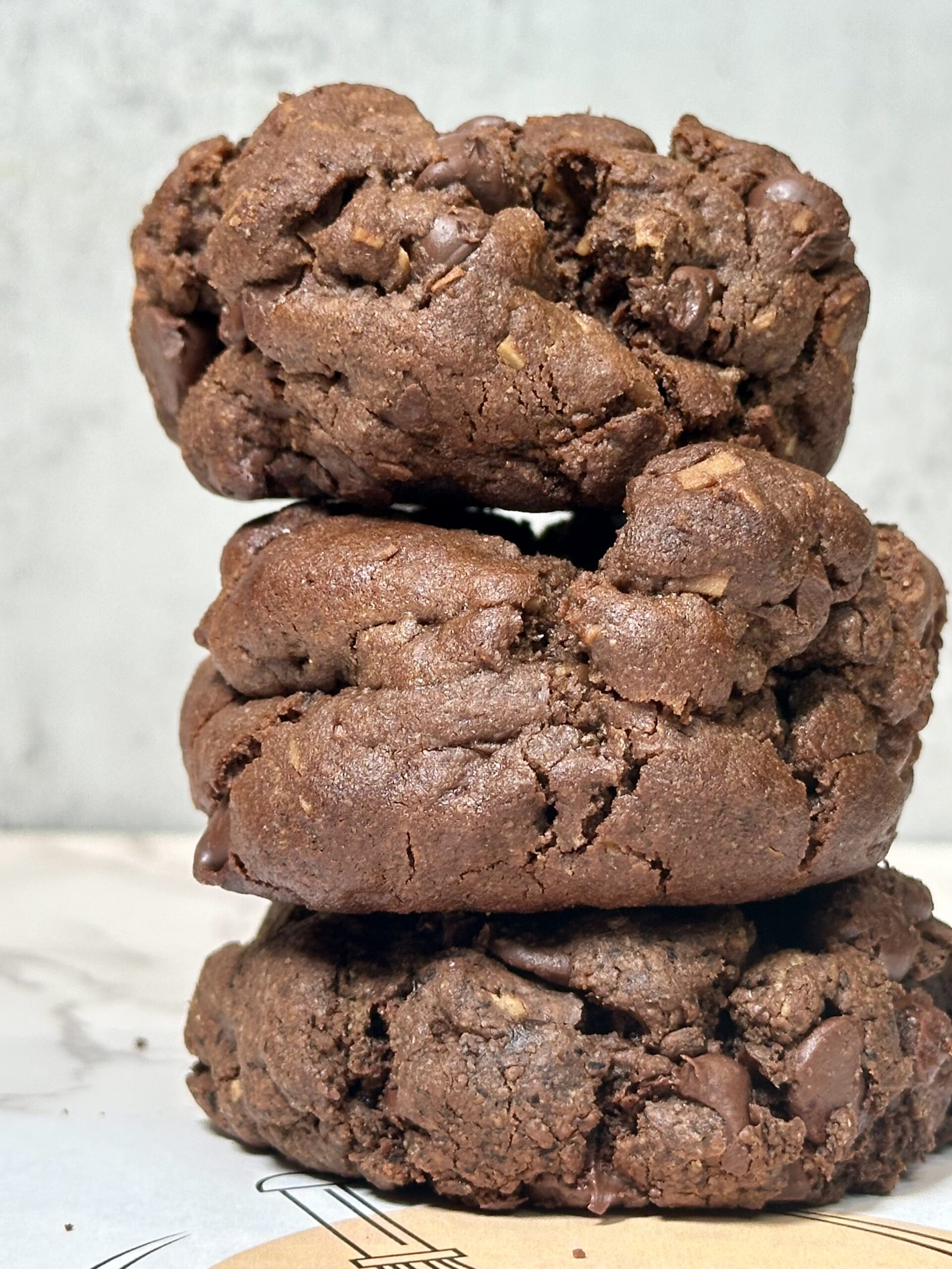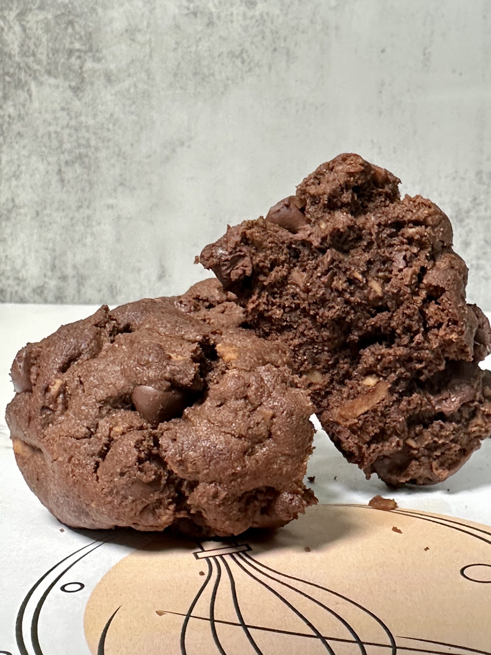 Ingredients: Oat Flour, Quinoa Flour, cocoa powder, salt, baking soda, coconut sugar, honey, vanilla extract, chocolate chips.